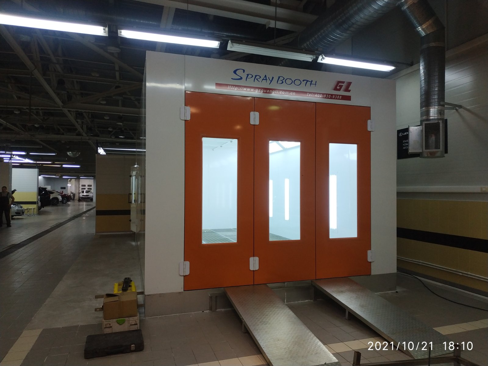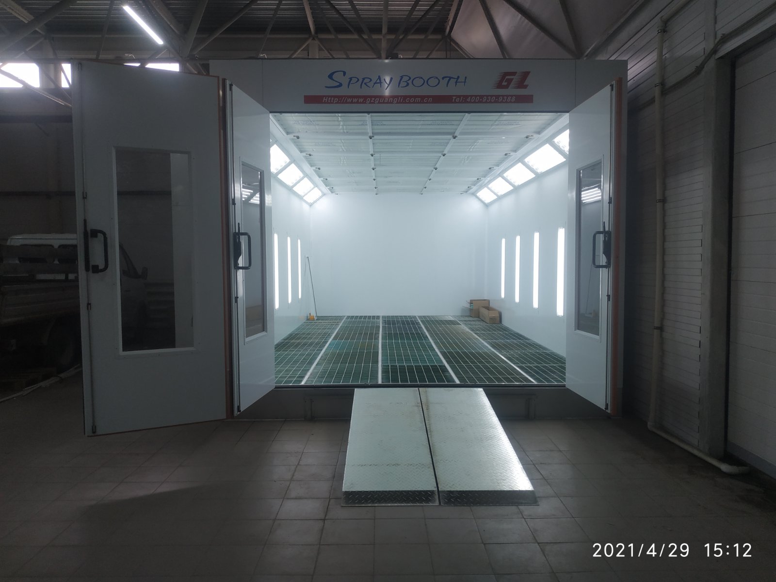 Окрасочно-сушильная камера Guangli GL3 имеет в своей основе металлическое основание высотой 30 см. Напольные решётки выдерживает нагрузку до 600 кг на одно колесо. В стандартном исполнении камера Guangli GL3 комплектуется дизельной горелкой Riello G20 итальянского производства. Мощность горелки составляет 202 кВт, 90 % нагретого воздуха подвергается рециркуляции. Корпус камеры собирается из сэндвич-панелей толщиной 50 мм. В качестве наполнителя используется пенополистирол, опционально можно в качестве наполнителя использовать минеральную вату. Фронтальная дверь покрасочной камеры состоит из 3-х створок, аварийная дверь находится сбоку камеры, она оборудована замком «Антипаника».