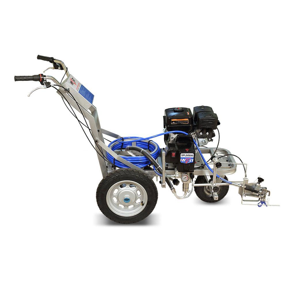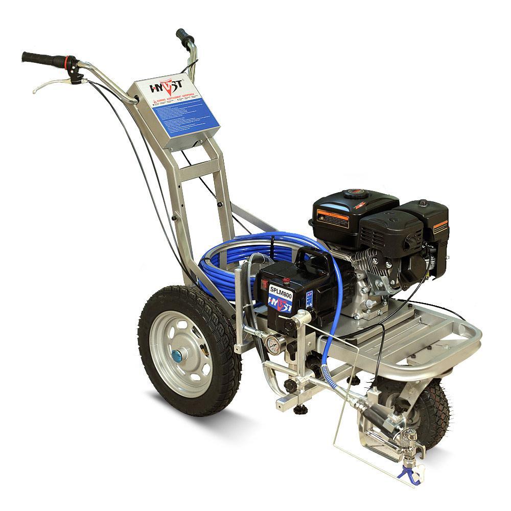 HYVST SPLM 800 - машина для нанесения дорожной разметки краской на асфальт. Машина собрана на базе поршневого насоса для краски и бензинового двигателя. Машину для нанесения дорожной краски можно толкать, также ее можно использовать как подающий поршневой насос с бензиновым двигателем и держать машину в кузове грузовика, и наносить краску окрасочным пистолетом вручную по шаблону. Машину может наносить как прямые линии, так прерывистые. Также, благодаря переднему поворотному колесу, можно наносить радиусы, фиксируя переднее колесо под нужным углом.