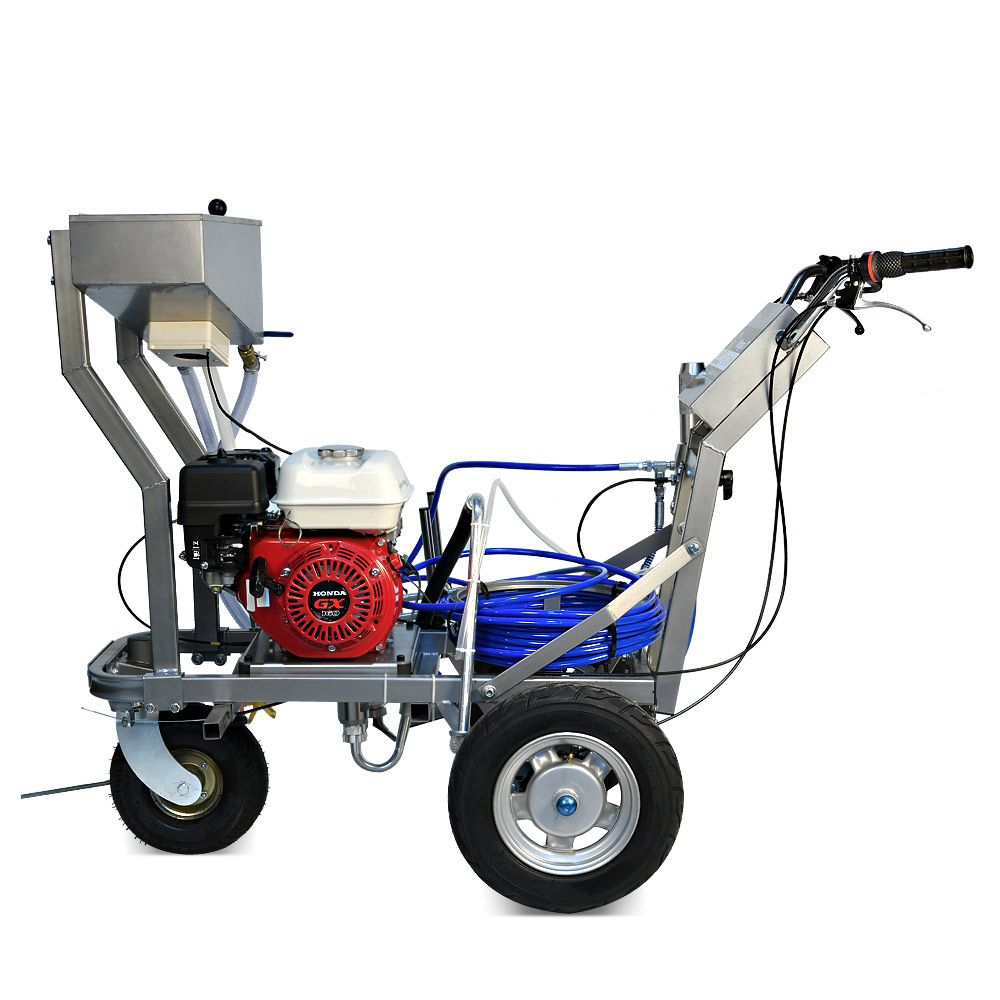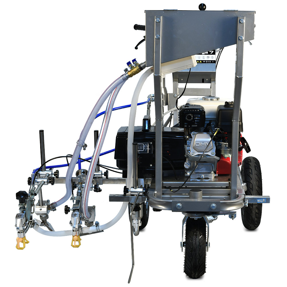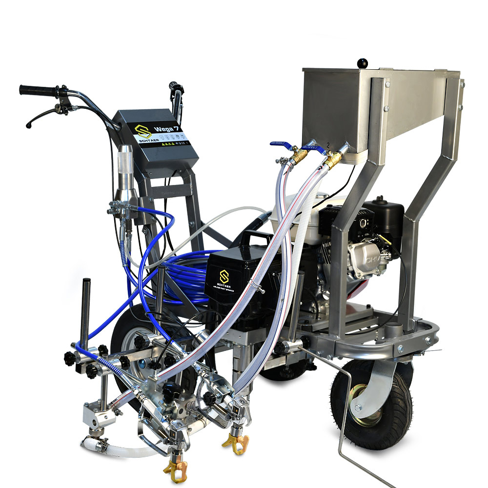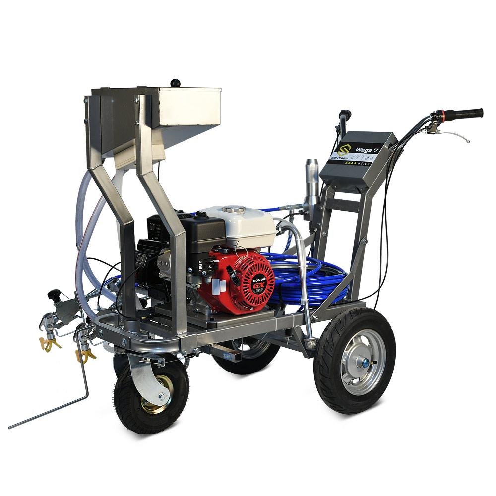 Schtaer WEGA 7G - разметочная машина для безвоздушного нанесения дорожной разметки краской на асфальт, оснащенная баком для стеклошариков и комплектом оборудования для их распределения по линиям краски. Разметочная машина собрана на базе поршневого насоса для краски и бензинового двигателя. Машину для нанесения дорожной краски можно толкать, также ее можно использовать как подающий поршневой насос с бензиновым двигателем и держать машину в кузове грузовика, и наносить краску окрасочным пистолетом вручную по шаблону. Машина может наносить как прямые линии, так прерывистые. Также, благодаря переднему поворотному колесу, можно наносить радиусы, фиксируя переднее колесо под нужным углом. Машина может наносить двойные сплошные и прерывистые линии, пешеходные переходы. Максимальная длина шланга 90 метров. Сопло 1908.