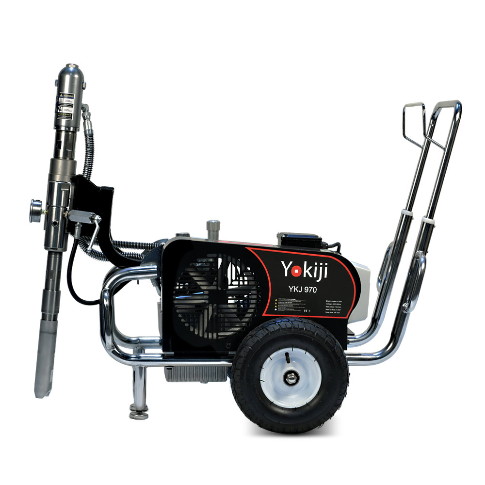 YOKIJI YKJ 970 – гидропоршневой безвоздушный электрический окрасочный аппарат. Он может применяться для распыления материалов с высокой, средней и низкой вязкости: красок, эмалей, шпаклевок, огнезащитных, гидроизоляционных, антикоррозийных и цинконаполненных составов, мастик, грунтовок. Аппарат используется на стройплощадка при отделке помещений, зданий и сооружений, а также на производствах при покраске больших конструкций. Модель работает от розетки 220B и обладает высокой производительностью (10 л/мин); позволяет присоединять до 3 малярных постов и подавать материал на высоту до 90 метров.