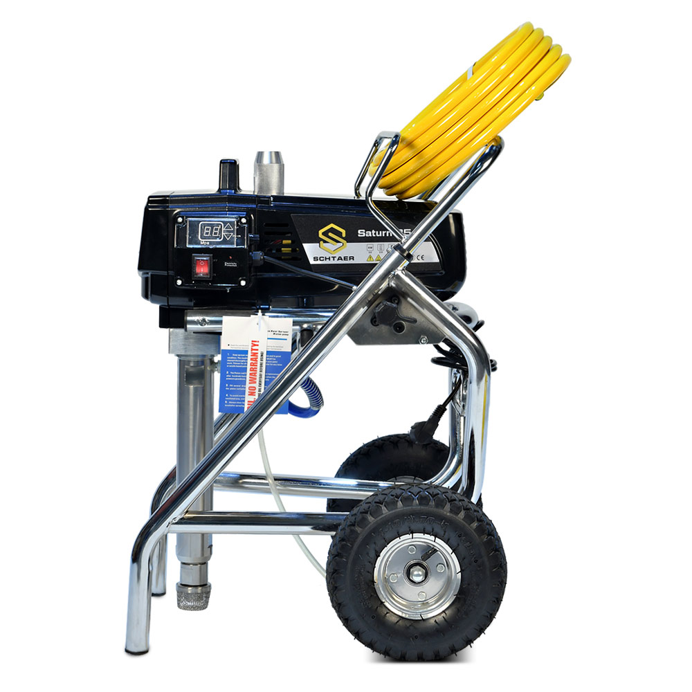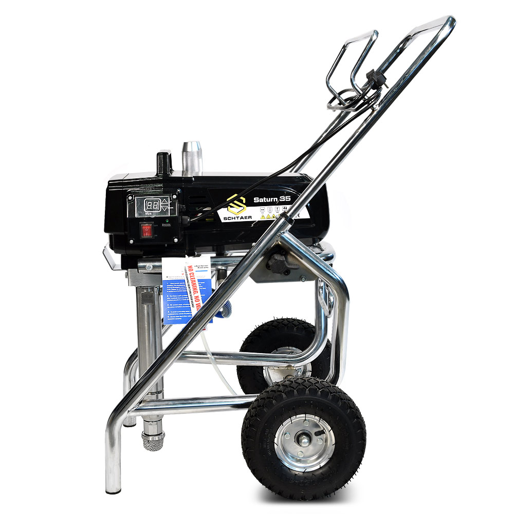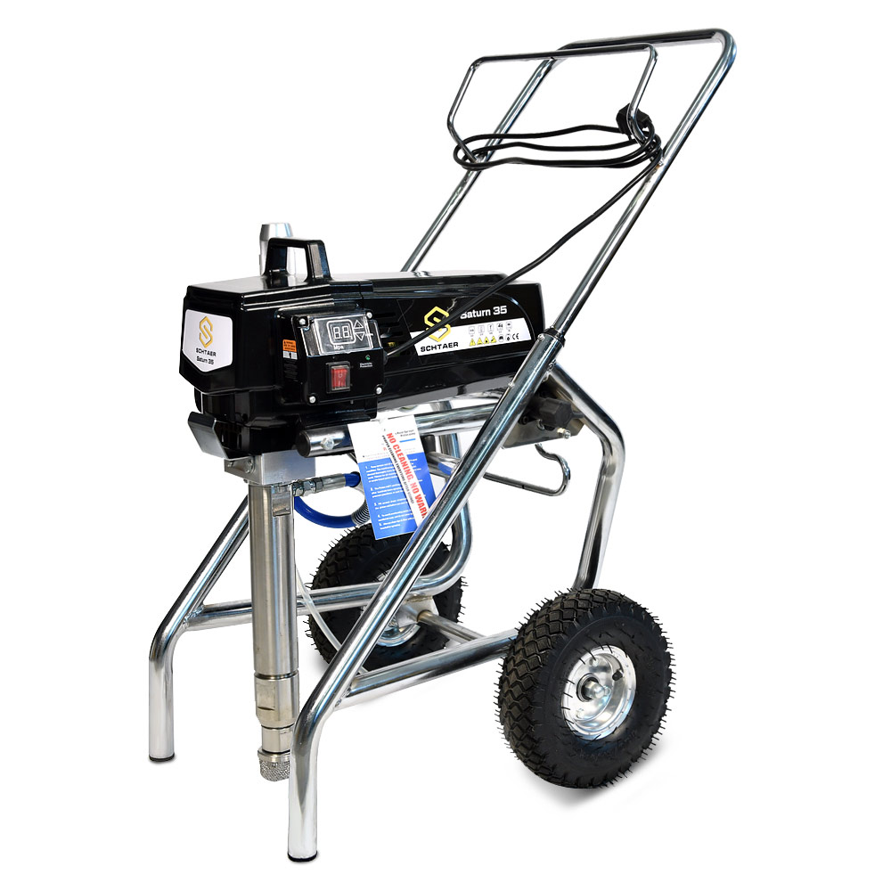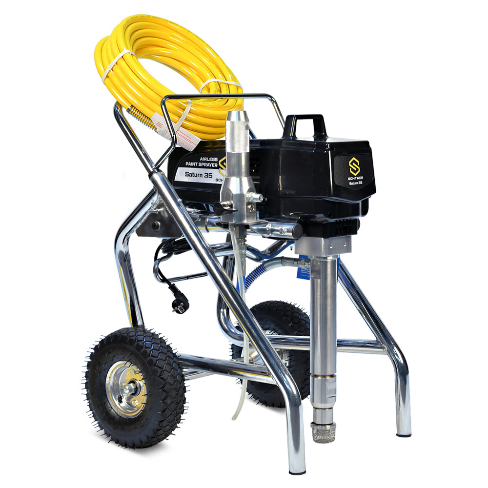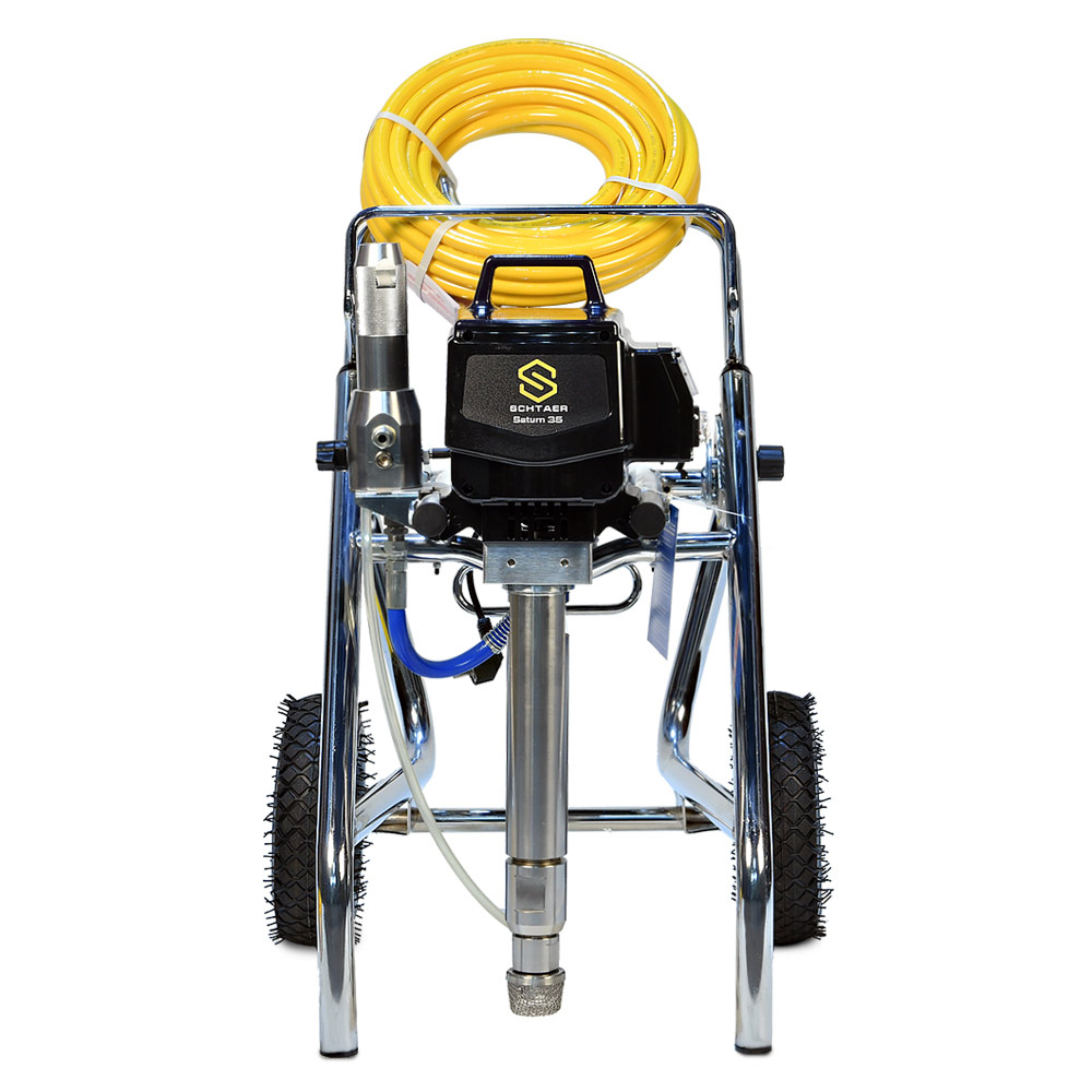 Schtaer Saturn 35 - оборудование для окраски под высоким давлением через окрасочный краскопульт безвоздушного распыления. Окрасочный агрегат безвоздушного распыления предназначен для использования на строительных площадках и промышленных предприятиях. Он применяется для распыления под большим давлением красок средней и высокой вязкости. таких как: огнезащитные краски, фасадные краски, водоэмульсионки, латексные и акриловые краски, грунтовки и эмали по металлу, эпоксидные материала, однокомпонентные краски и двухкомпонентные составы с большим временем жизни, краски и лаки по дереву. Окрасочный аппарат используют для покраски вязкими красками через один окрасочный пистолет, при распылении лакокрасочных материалов средней вязкости аппарат возможно использовать на два краскопульта. Окрасочный аппарат засасывает краску через специальный прямой заборник с фильтром с помощью поршневого электрического насоса. На выходе из насоса краска также фильтруется перед подачей на безвоздушный краскопульт.